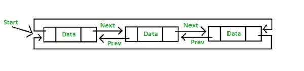 - 순환 이중 연결 리스트: 순환 이중 연결 리스트(Circular Double Linked List)는 이중 연결 리스트(Double Linked List)와 순환 연결 리스트(Circular Linked List)의 속성을 모두 가지고 있는데, 두 개의 연속된 요소가 이전 포인터와 다음 포인터로 연결되거나 연결되고 마지막 노드가 다음 포인터로 첫 번째 노드를 가리키고 첫 번째 노드도 다음 포인터를 가리킵니다. 이전 포인터에 의한 마지막 노드.